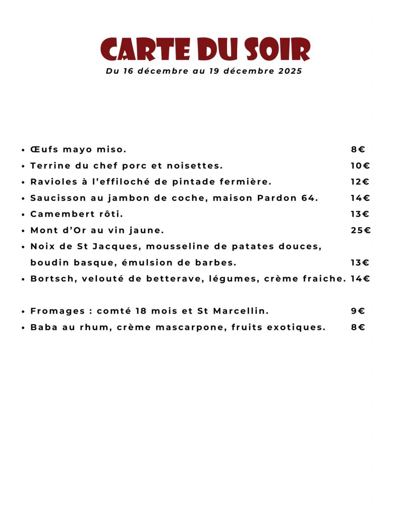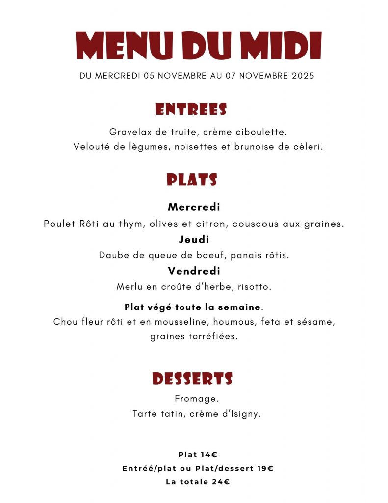 Midi : On vous propose un menu de bistrot avec Entrée/Plat/Dessert. Tout est fait maison avec des produits frais.