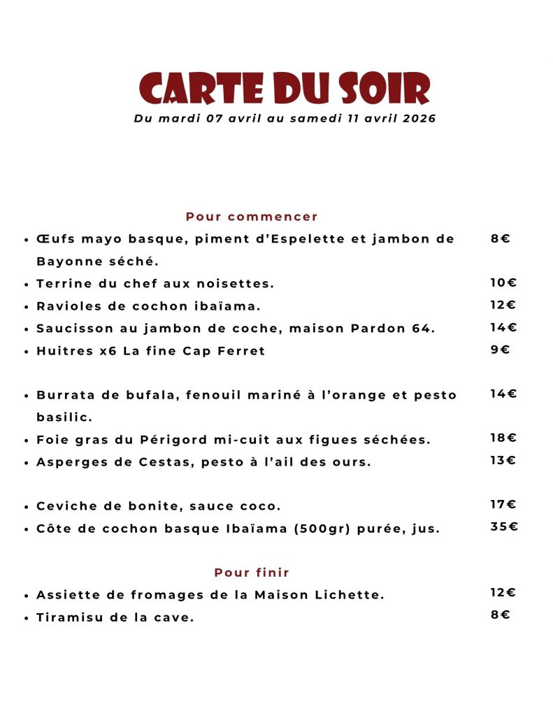 Soir : Du mardi au samedi soir :